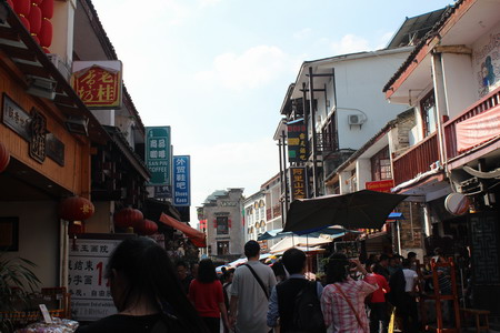 近4小時的江上漂游后,我們抵達了桂林陽朔。陽朔是桂林市南邊的一個小縣城,風光秀美有“小桂林”之稱,更有“桂林山水甲天下,陽朔風光甲桂林!”的美譽。在陽朔,西街是必逛不可的。商店、酒吧、照相館,一應俱全,而門牌和菜單很多廣告大都是外文書寫的。大鼻子深眼睛的外國朋友三個一伙,五個一群的四下坐著,恍惚間讓人覺得似乎身處異國他鄉。那些老房子,酒吧,特色小店,粗布衣服、工藝品、閑著沒事的老外都是西街的主要構件。